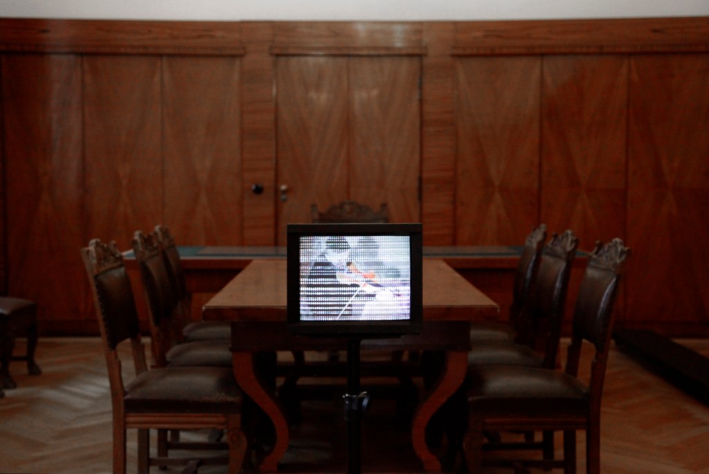No Exit explores the impossibility of poeticizing human suffering. The video was taped over the course of two days (March 6-7, 2023) in a small room in the basement of the Katholische Hochschule, formerly used as a prison by the Soviet Staatssicherheitsdienst (KGB).